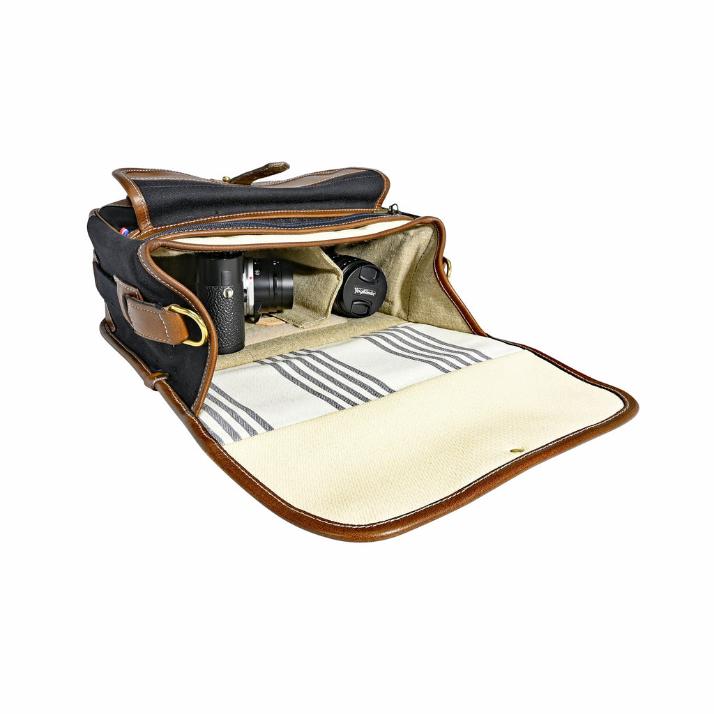 • Correa de hombro extraíble - con almohadilla de cuero - pasa debajo del bolso a través de la base protegida de cuero, permitiendo el acoplamiento de bolsas laterales para accesorios