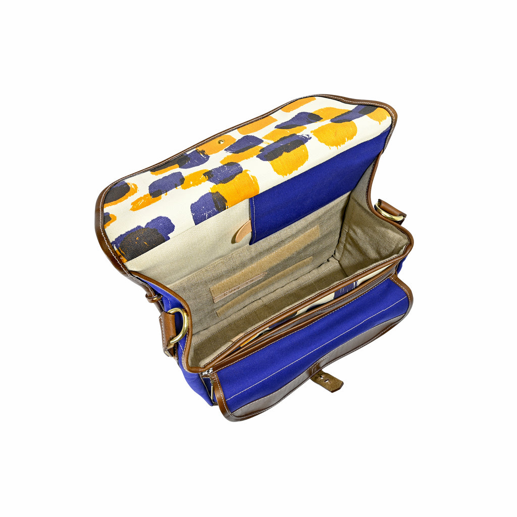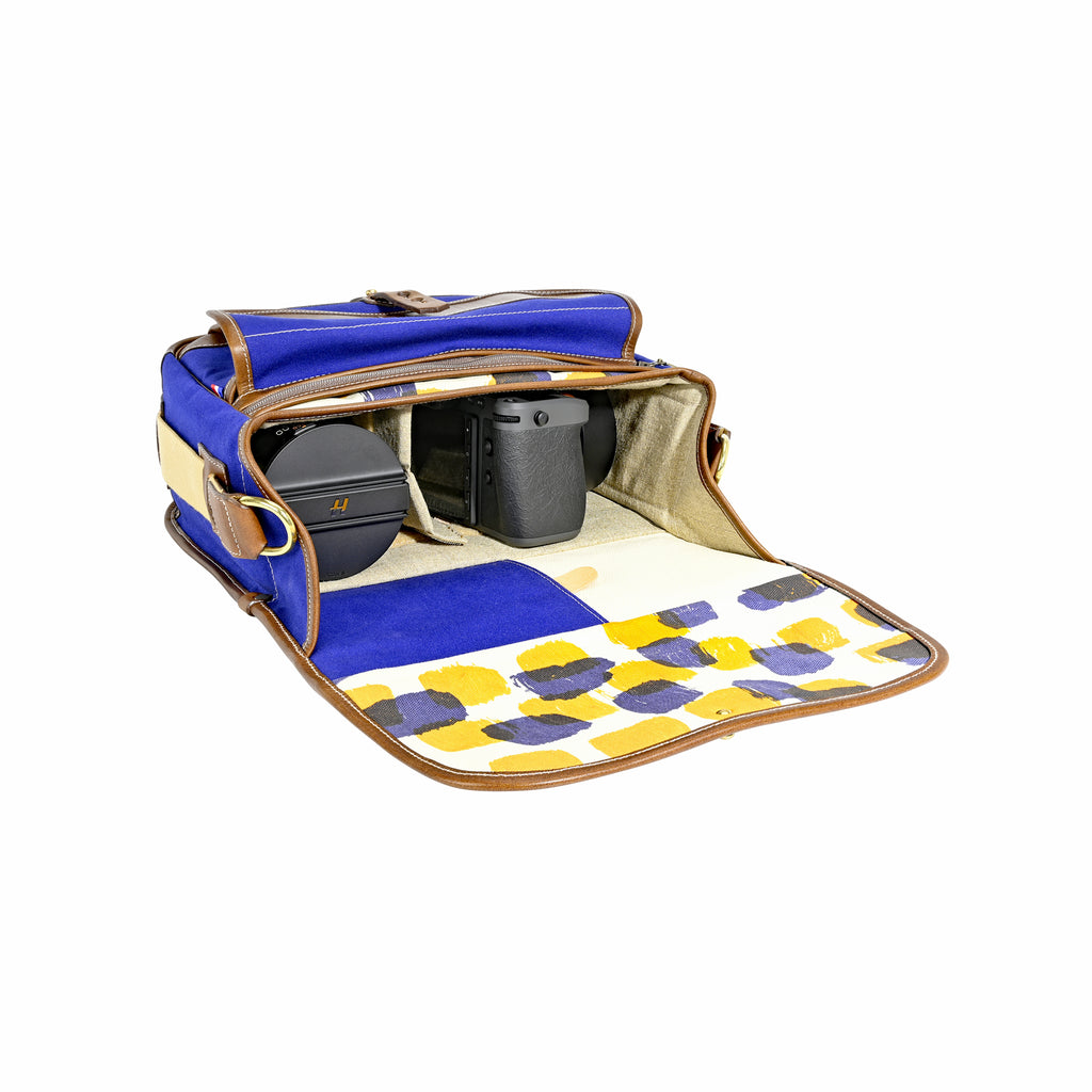 • Una correa de hombro extraíble de algodón de tejido pesado (con almohadilla de cuero) sostiene el bolso y permite acoplar bolsas laterales para accesorios.