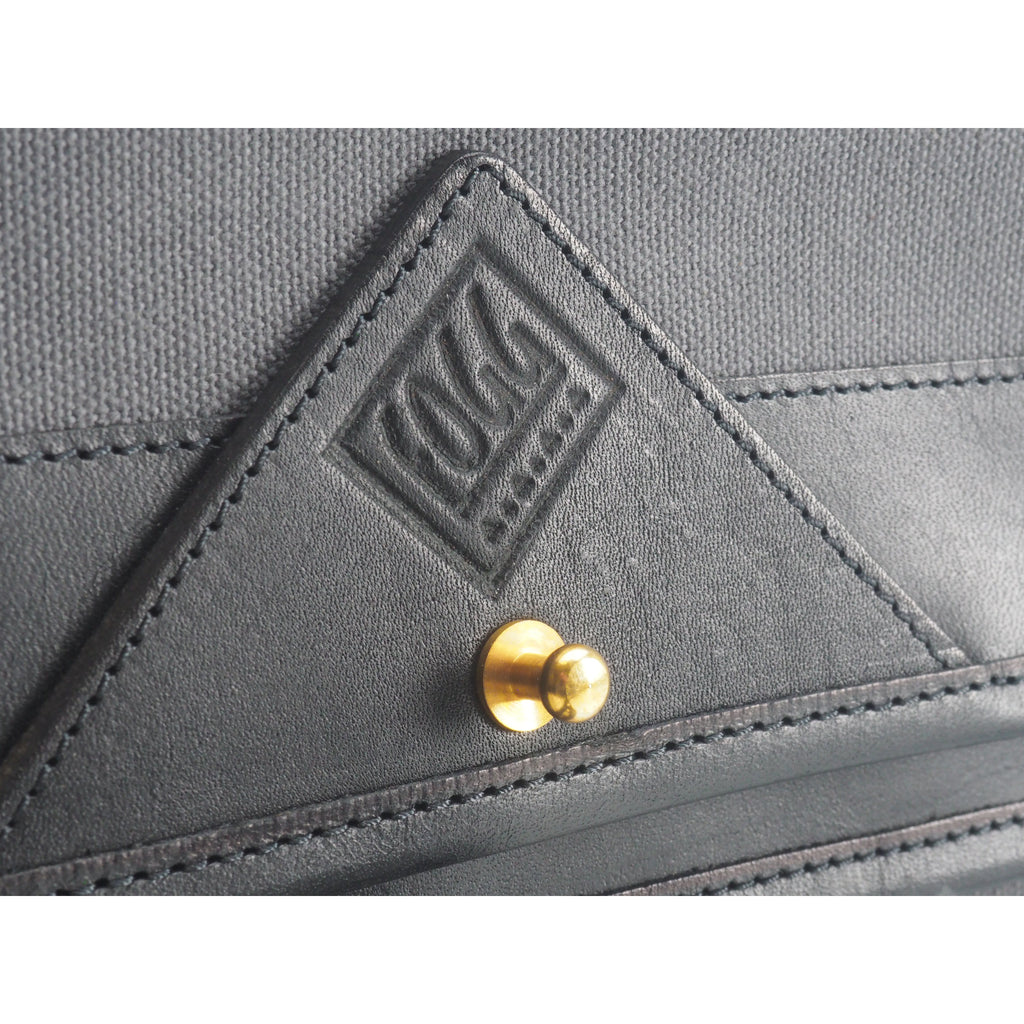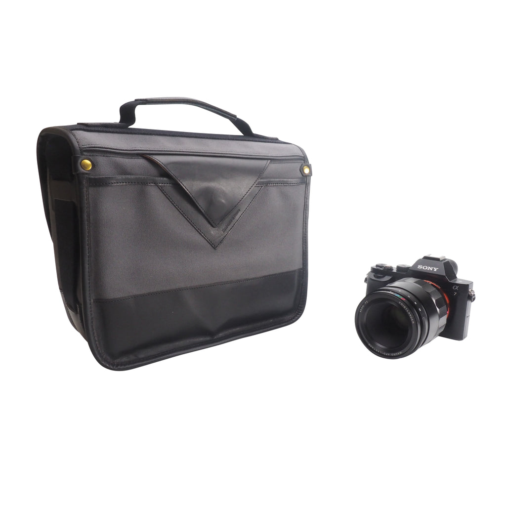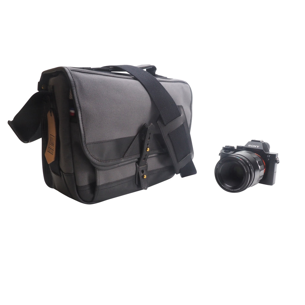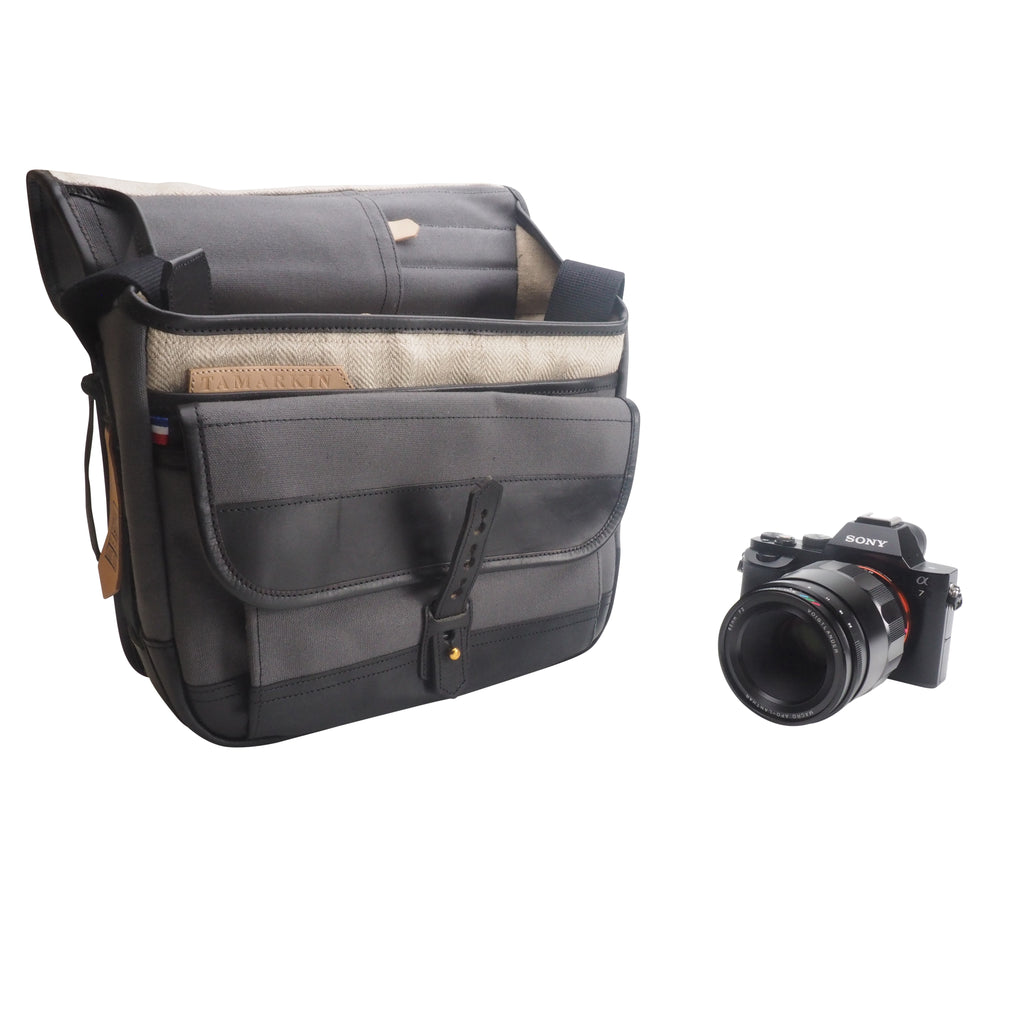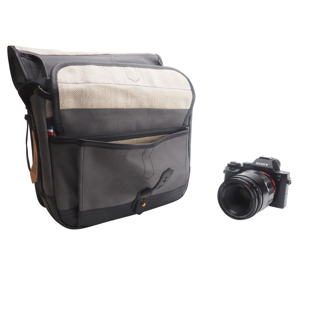 • Une bandoulière amovible en coton épais (avec coussinet en cuir) soutient le sac et permet le couplage de pochettes latérales pour accessoires.