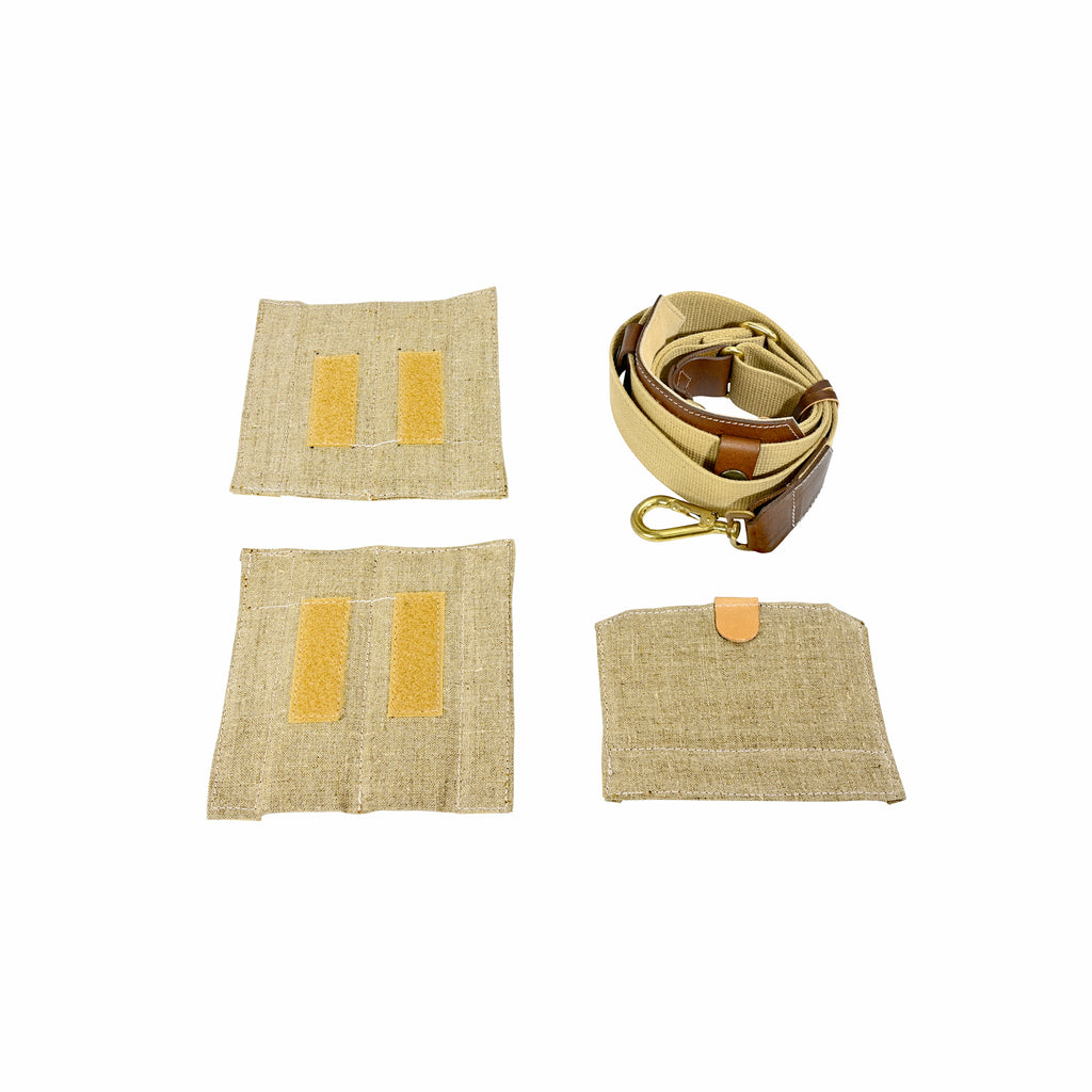 • A removable heavy-weave cotton shoulder strap - (with leather pad) cradles the bag and allows the coupling of accessory side pouches